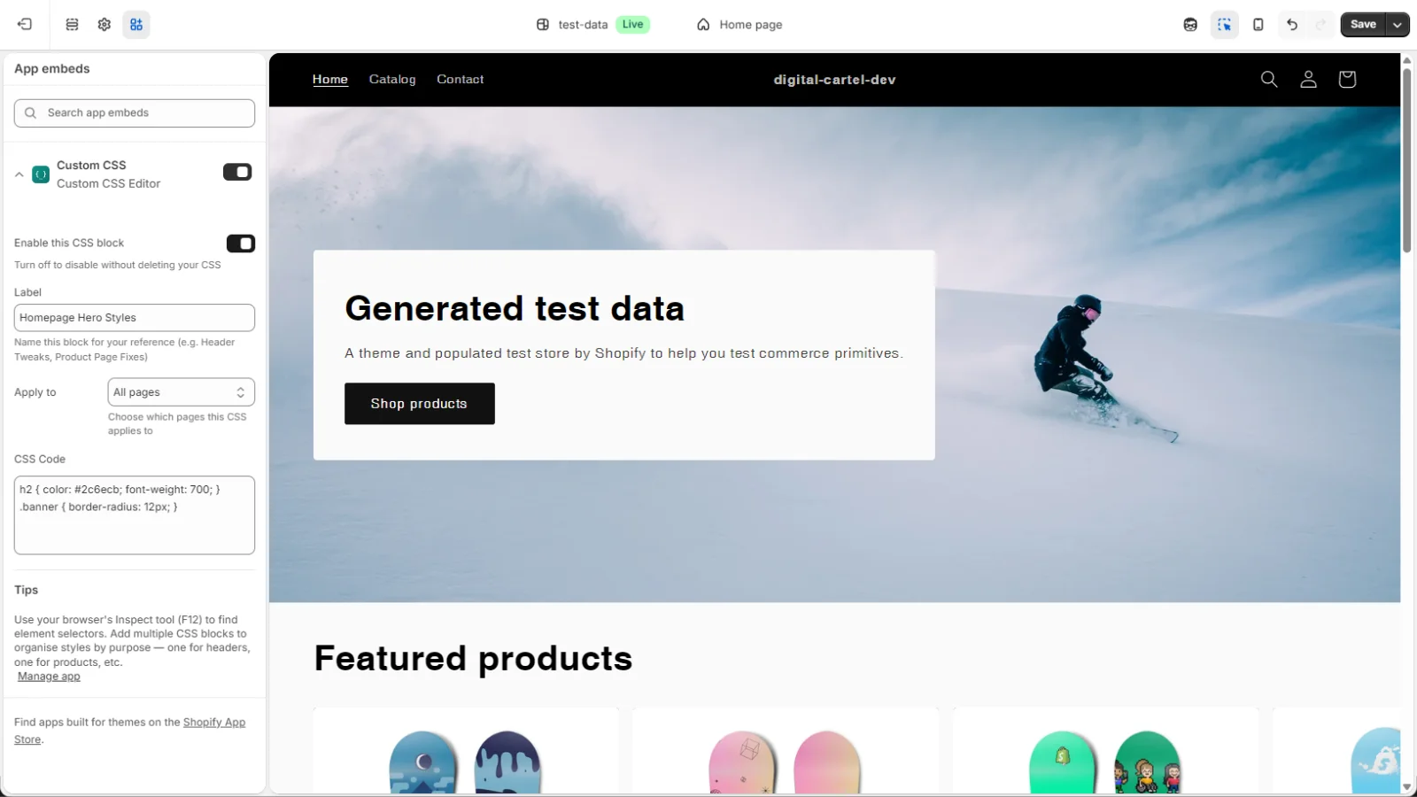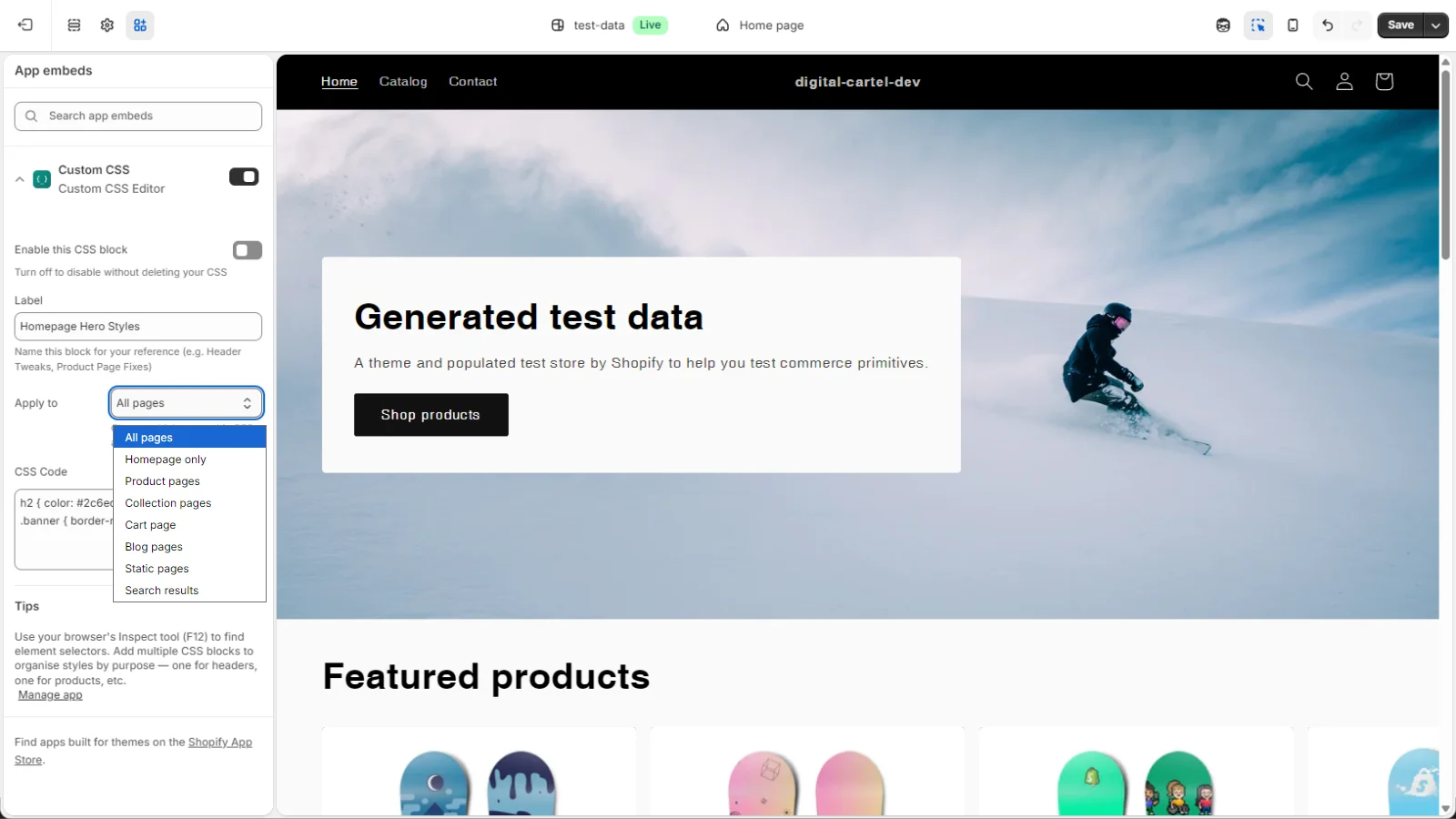 Apply CSS to specific pages, collections, or product types. Global or targeted — your choice.